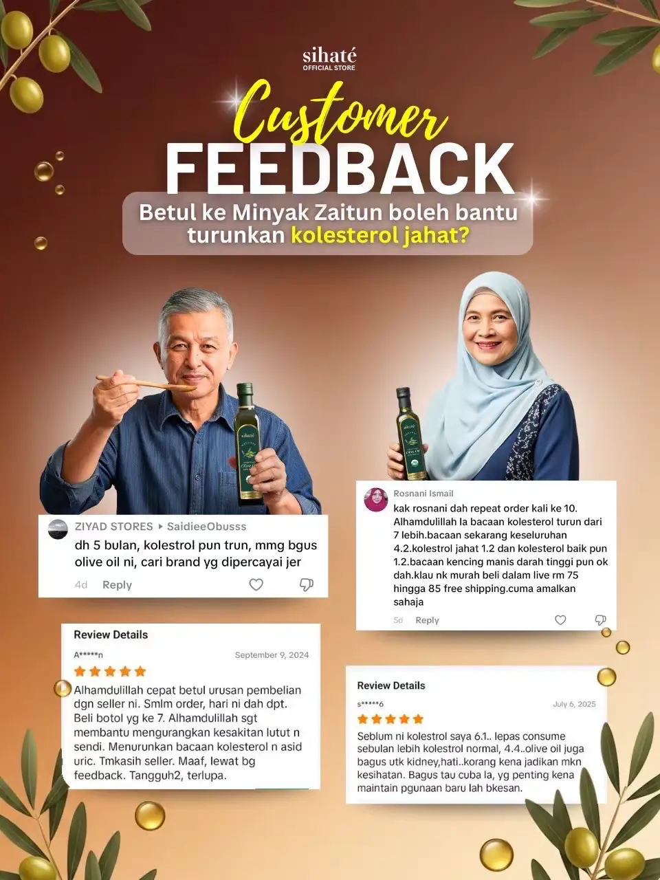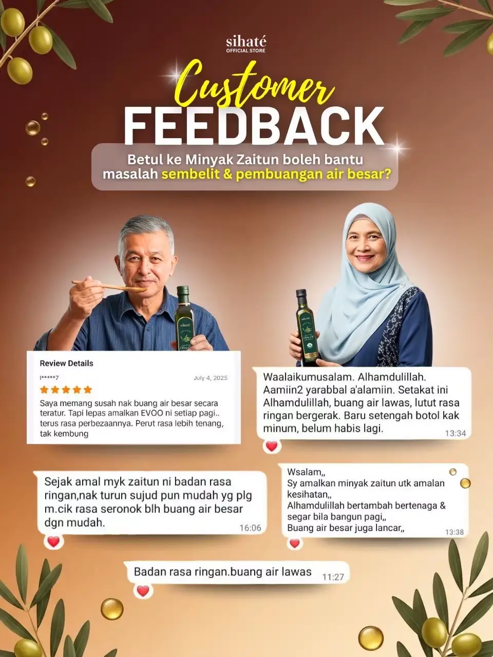 Testimoni mereka adalah bukti bahawa Minyak Zaitun Sihate' mampu membawa perubahan besar. Kini, tiba masanya untuk anda pula menikmati hidup yang lebih sihat dan bahagia, demi diri sendiri dan insan-insan tersayang.